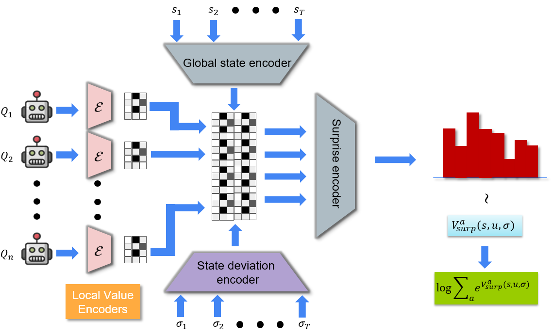 Below is an intuitive illustration of the objective. The joint agent population aims to minimize surprise corresponding to minimum energy configurations. Agents collaborate in partially-observed worlds to attain a joint niche. This local niche implicitly corresponds to a fixed point of on the energy landscape. Note that agents act locally with actions conditioned on their own action observation histories. It is by virtue of preconditioned values estimations that the surprise minimization scheme informs agents of joint surprise. Upon population’s convergence to a suitable configuration, agents continue to experience minimum (yet finite) surprise arising from evironment dynamics.